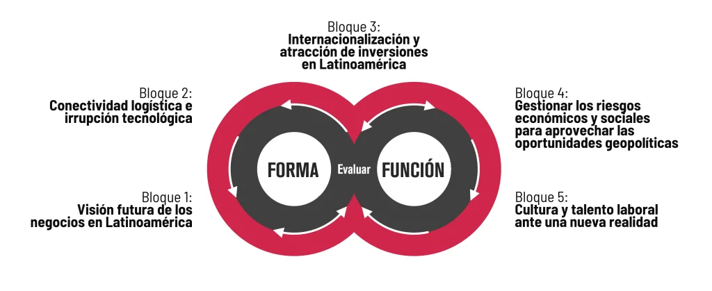 Para ello, con CEOs, Presidentes y Directores Generales de Europa, Estados Unidos, Centroamérica y Suramérica abordaremos de manera dinámica, ágil y práctica, cinco bloques temáticos que hemos diagnosticado como los más influyentes para el futuro y la prosperidad de nuestras organizaciones: